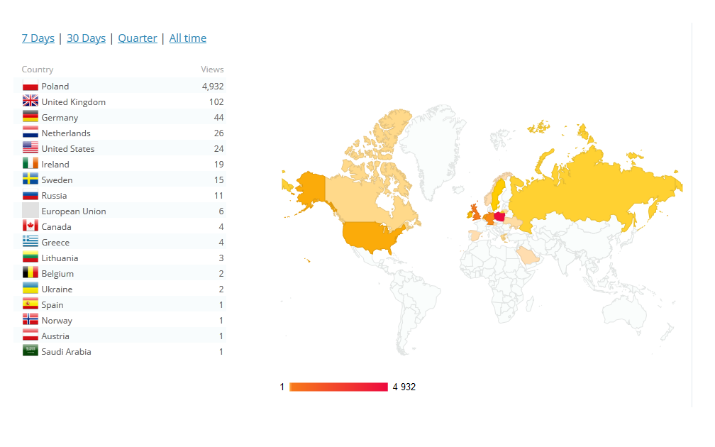 Na rysunku można zobaczyć z jakich krajów mieliśmy wejścia na naszą stronę. Po kliknięciu w obrazek zobaczycie pełny czytelny schemat.